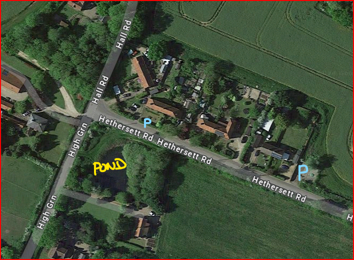 The Postcode is NR9 3BG. Please park at the locations shown by a P on the picture to the left (click to enlarge). It is possible to get two cars on the driveway to the pumping station that lies to the East of the last house.